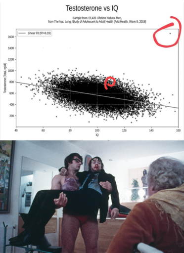 Pictured: Outlier (155 IQ, 1650 testosterone ng/dl) carries control (110 IQ, 800 testosterone ng/dl).