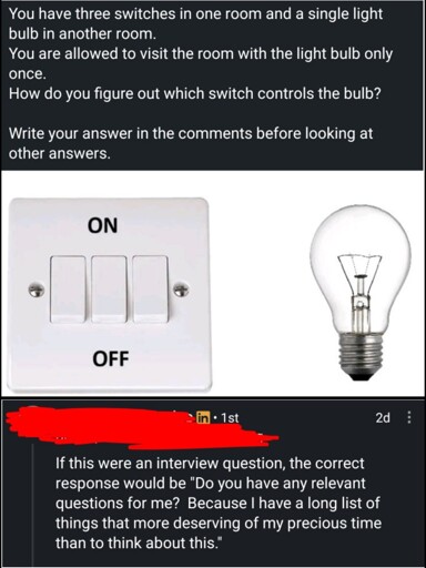 It’s compounded by the fact that the proposed physical solution isn’t even very reliable, as lots of people in this thread have said. If we’re stepping outside of the logic puzzle constraints, why not just leave the door to the room open? Or have someone stand inside and shout when the light turns on? Or ask someone who knows these switches? Or any number of boring non-brain teaser solutions.