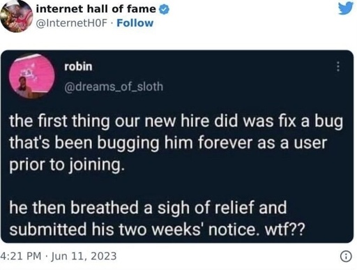 CmdrKeen@lemmy.today to Programmer Humor@programming.dev · 2 years agoAbsolute legendlemmy.todayimagemessage-square11fedilinkarrow-up13arrow-down10