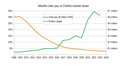 2.) Mozilla is a nonprofit to begin with. The goal is not to make money on Firefox or any other projects for that matter. The goal is to make the internet better for everyone. Firefox’s profitability will never have any real impact on Chairman pay.