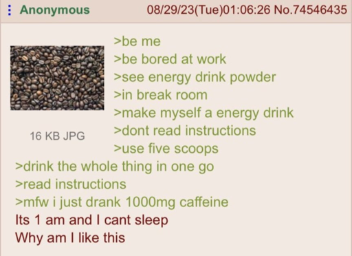 arrow-up11arrow-down1imageAnon tries something new in his coffeesh.itjust.worksdramaticcat@sh.itjust.works to > Greentext@lemmy.ml · 2 years agomessage-square0linkfedilink